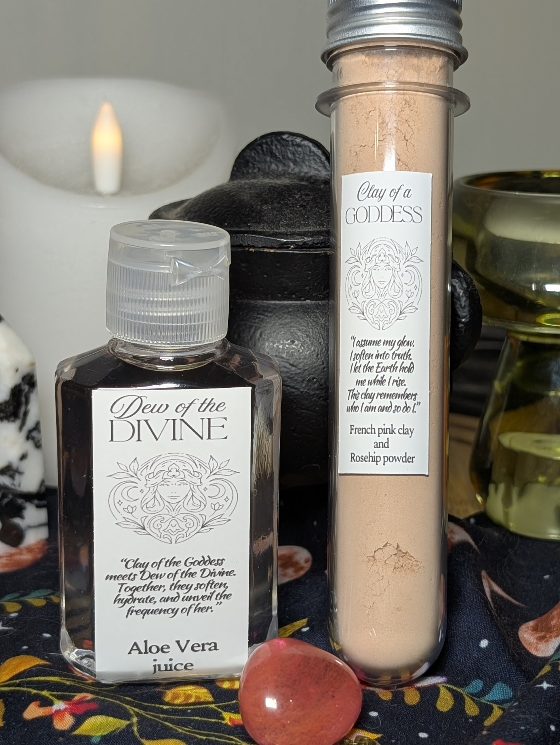 Clay of the Goddess is not just skincare, it’s sacred remembering. This ritual suite blends French pink clay and rosehip powder with pure aloe vera juice to detoxify gently, hydrate deeply, and unveil your natural radiance. Paired with crystal allies and symbolic tools, it invites you to soften into sovereignty and activate your chosen timeline.